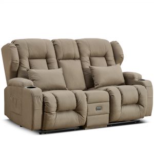 URRED Loveseat Recliner Sofa with Flipped Backrest Console, RV Manual Reclining Loveseat Couch Home Theater Seating with Cup Holders/Side Pockets/Pillows/Drawers/Outlets for Living Room, Khaki
